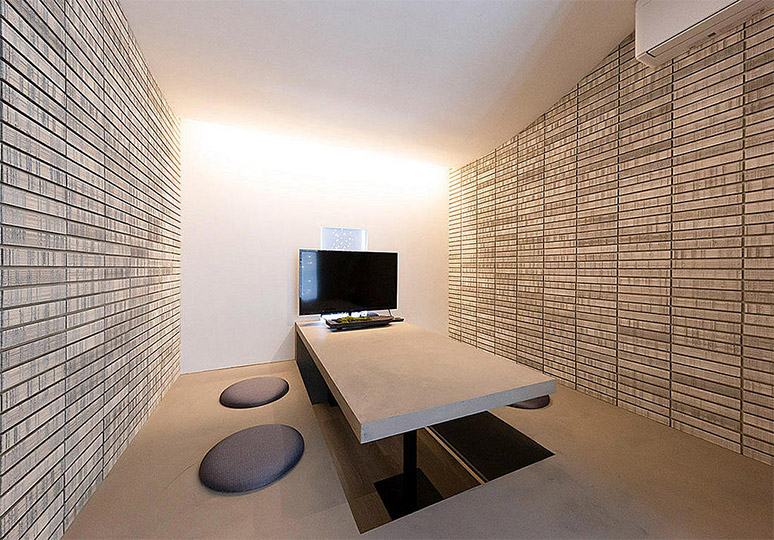天井全體をRにし、両サイドの仕上げを変えて広がりを表現(xiàn)した事例。ダウンライトが曲線を描く天井やタイルを不規(guī)則に照らし、陰影が空間の表情を豊かにしています。