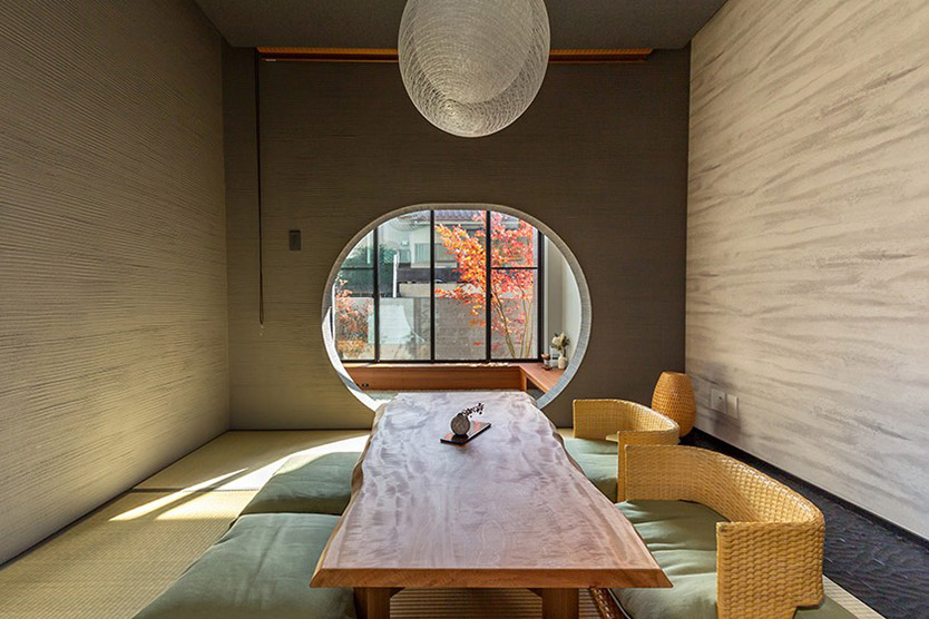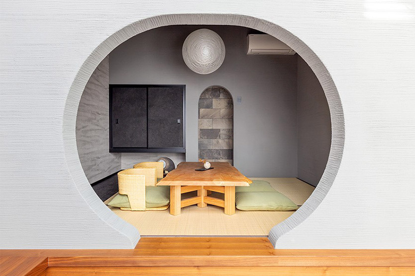 リビングから和室を眺めると、楕円形に丸くくりぬいた壁の奧に、丸い照明、アーチ狀の入り口と連続的に曲線が重なるような仕様に。Rをバランスよくリンクさせることで、直線と曲線がなじむよう設計をしました。