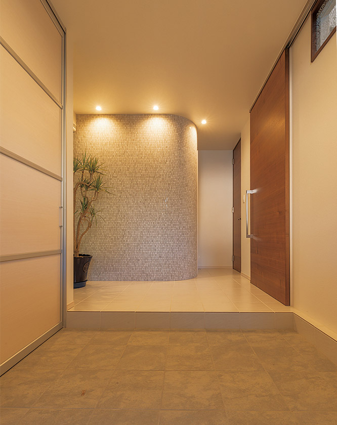 玄関からホールに入った正面に、印象的なRの壁を設計したこちらの事例。玄関はお客さまをお迎えする家の顔であり、Wさま邸ではビルトインガレージから家の中に入る際に毎日通る場所でもあります。