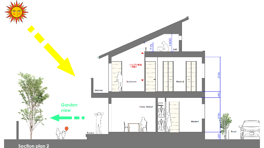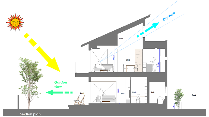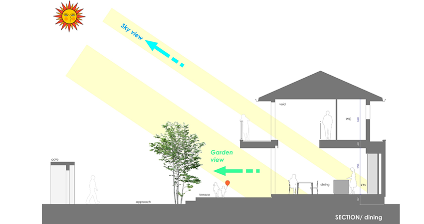 目賀田:その通りです。例えば下の図のように、深い軒下空間を作ると1階からの日差しは遮られますが、吹き抜けにすることで2階から光を取り込むことができます。光が影を強調し、影が光を強調するような情緒的な空間が內部に生まれます。日差しをコントロールしながら、キッチンに立っても空が見えて気持ちがいいですよ。