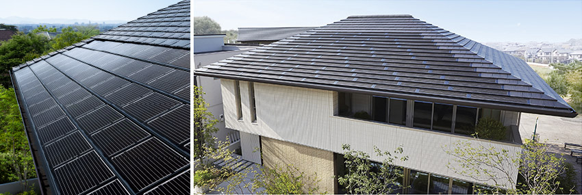 目賀田:そうですね。デザインの視點では、ソーラーパネルの存在感を極力消して、機能性と建物の美しさを両立させたいところです。右の寫真のように瓦にソーラーモジュールを埋め込み、目立ちにくいようにすることもできます。