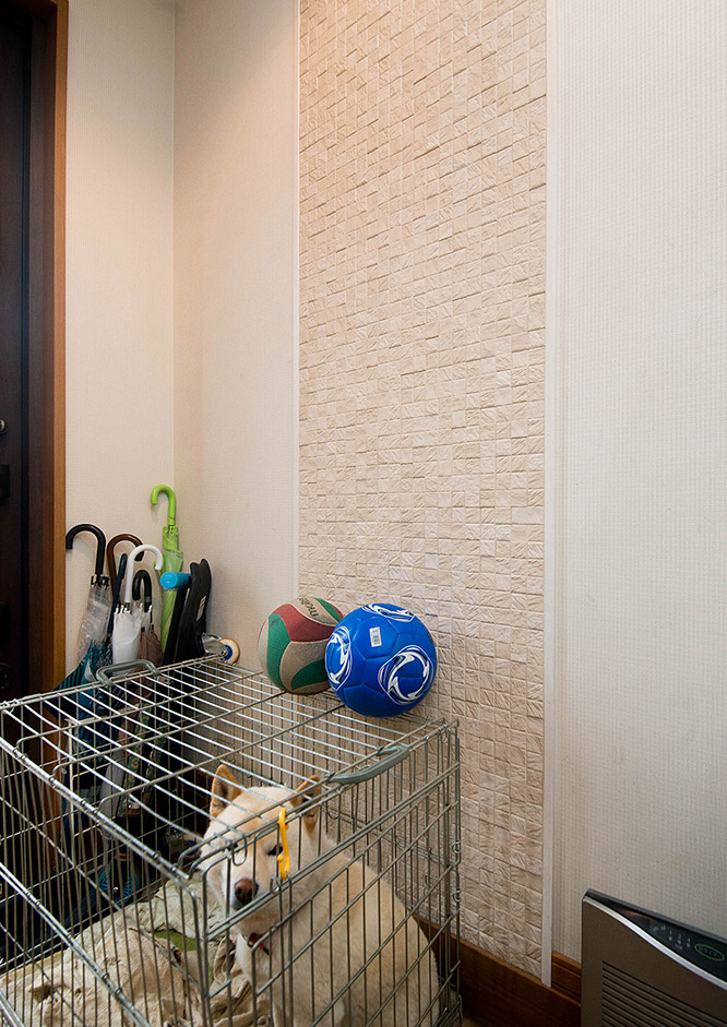 「友人の家で消臭ボードを見て気に入り、取り付けました。壁の一部にしか設置していないのですが、娘のトレシューをはじめ、子どもたちの靴はとにかく臭いので、臭いが軽減できています。玄関には愛犬もいるので、犬の臭いも抑えられていますね。」