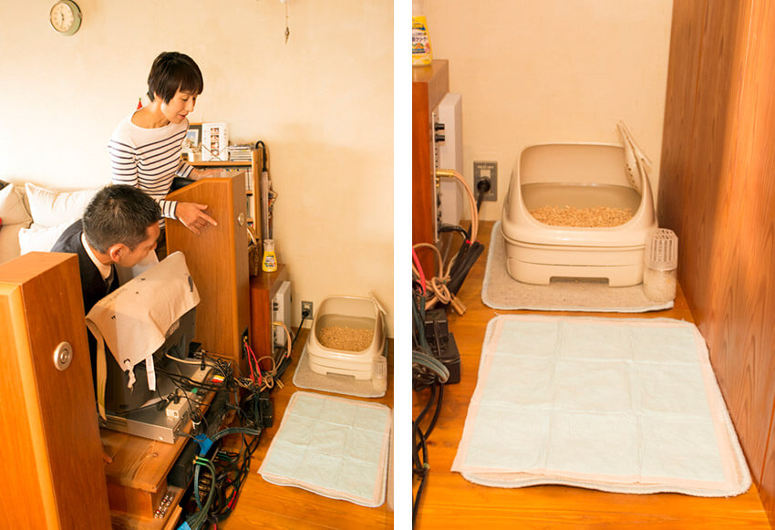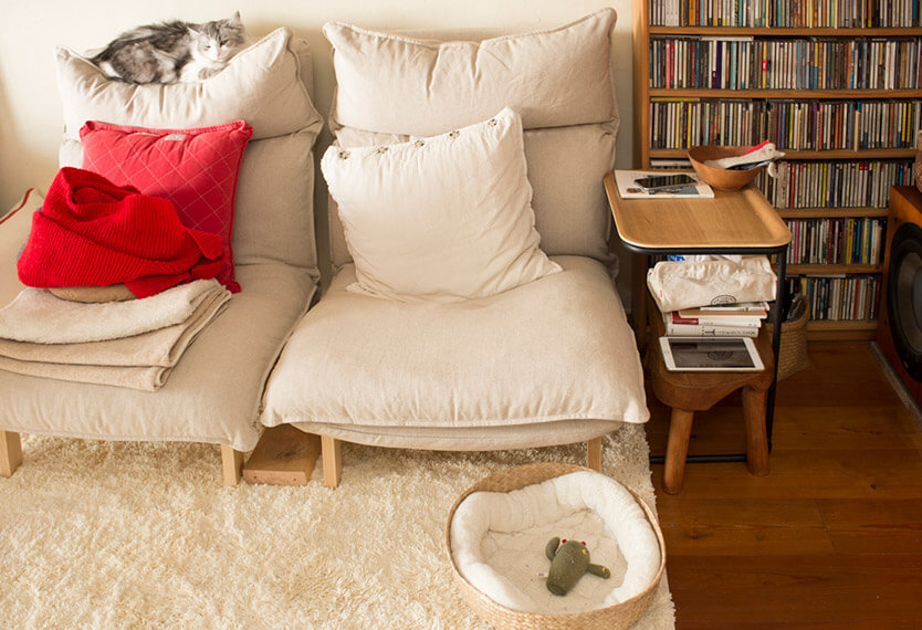 テレビの奧の、一見、木製の壁に見えるところが開閉するしくみなのですが、ここがわが家の収納スペースです。ペットのトイレ砂やシート、フードなどもまとめてここに入れてあるので便利ではありますが、収納スペースが足りないというのが正直なところ。「ここに納まるだけのモノでシンプルに暮らす」のが理想ですが、現実はなかなかそうもいかず、モノが溢れている始末。