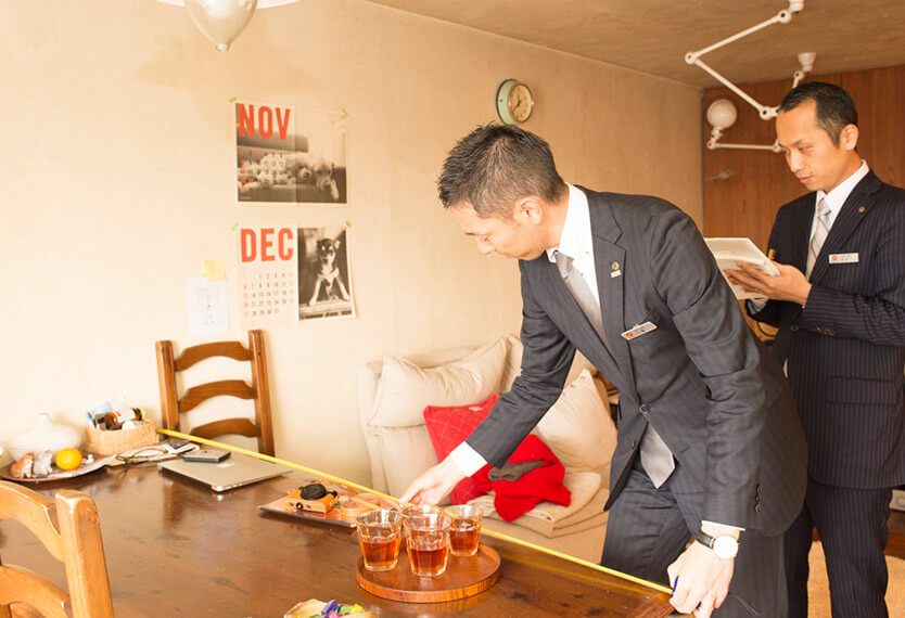 「仕事スペースを兼ねたリビング用デスクとなると…」とサイズを測る小坂さんと田中さん