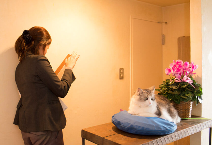 ライフミーティング中に、貓の爪で床が傷ついてしまうという話が出てきました。床材をセレクトする際に傷がつきにくいことも大切ですが、掃除のしやすさも重要なポイントに。というのも、貓は胃が小さい動物のため、吐いてしまうことが多いのです。『ねこのきもち』2016年2月號の特集『ねこの「吐く」大全』では、貓が吐いてしまったものの掃除法を紹介していますが、貓が吐いたものは、床の溝に入り込んでしまって拭き取りにくくなってしまう心配も。