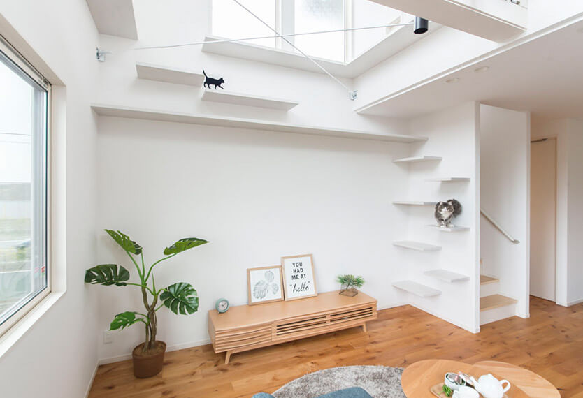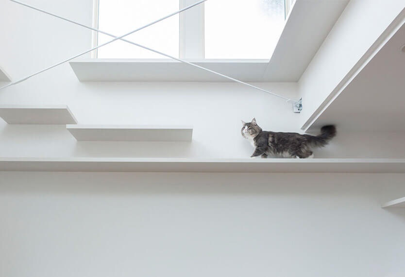 リビングの上を歩ける階段や貓用の道が縦橫にあり、天井が高く広さも十分。室內飼いの貓は運動不足になりがちとも聞きますが、これならそんな心配はいりません。貓タワーがなくても、高いところからリビング全體を眺めることができるので、貓はきっと満足するでしょう。