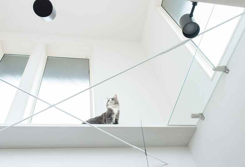 2階の床と同じ高さに、リビングを囲むようにキャットウォークが。一部、透明なアクリル板になっていて、ソファに座って見上げると「そこに貓の肉球が見える!」という幸せ感が半端ない演出が