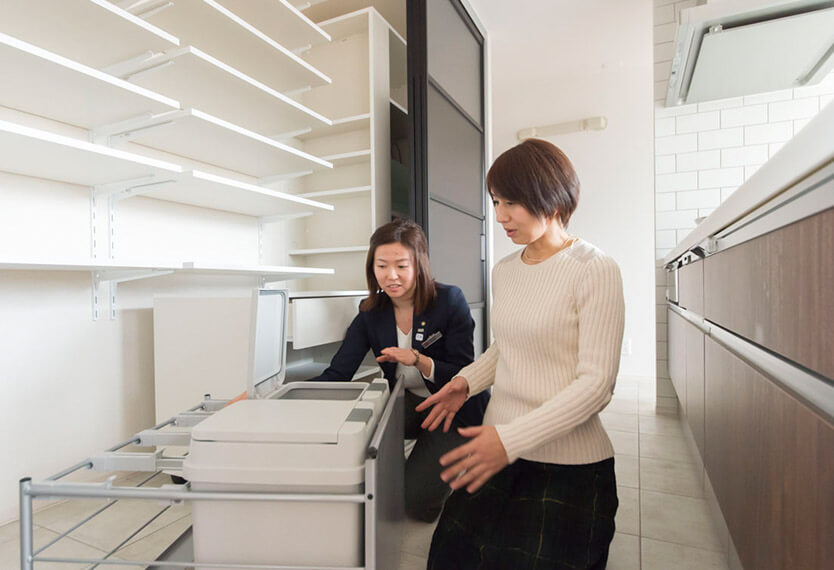 キッチンはシンプルで機能的。調理臺のうしろにあるパントリーには、食器をしまったり、食料をストックしたりと棚が豊富です。その上、ふた付きのゴミ箱まで収納できるところが気に入りました(わが家の場合、コウハイにゴミ箱をひっくり返されるおそれがあります)。