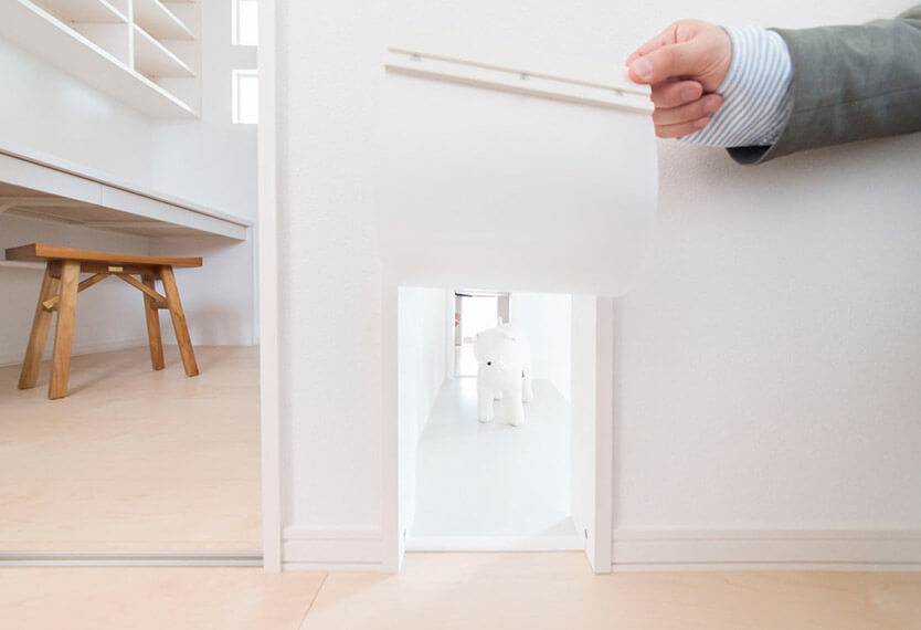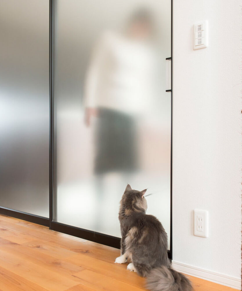 書斎スペースと通路を遮る扉も半透明に。集中して仕事をしたいときは、ここを閉めておけば貓は入ってもれません。でも存在だけは確認できる優しい設計です