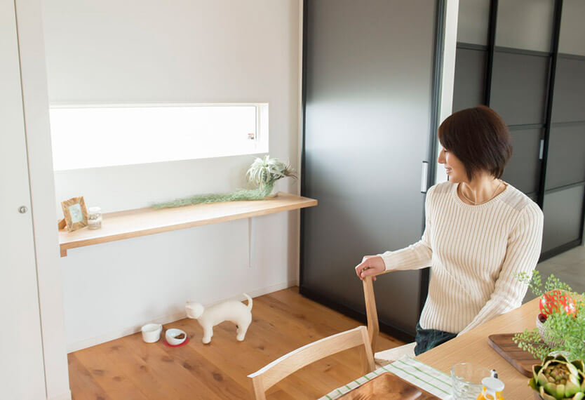 玄関に使用されている消臭作用がある壁、リビング?キッチンの窓に設置されたステンレス製の丈夫な網戸など、建材ひとつひとつにもこだわり「人と貓の動線を考慮し、機能的に作られた家」になっています。溫もりがあり、リラックスできる雰囲気です。