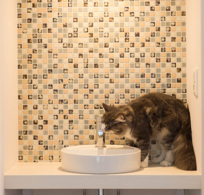 水飲みスペースも「貓に必要なものやスペースをあらかじめ組み込んだ」発想から付けたそう。新鮮な水が好きな貓のために、蛇口からはちょろちょろと細く水が流れて。どうですか、ムッシュ君の満足そうな顔!