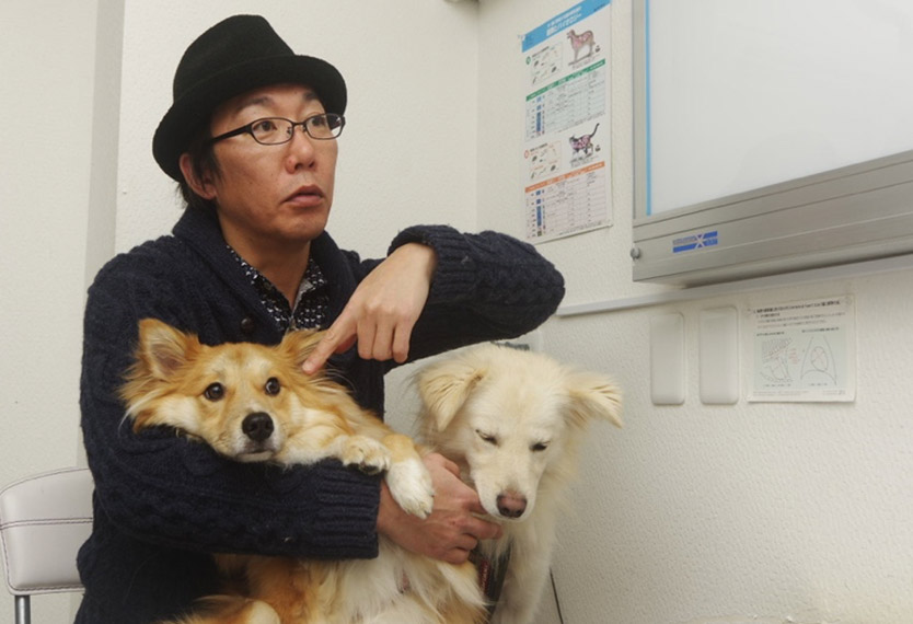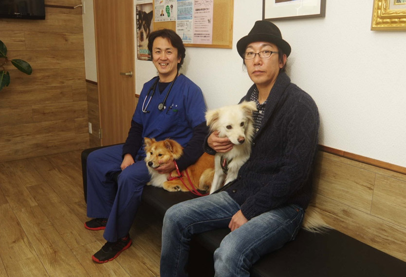 左から、橫浜山手犬貓醫(yī)療センター病院長上田一徳先生、福助、大吉、穴澤