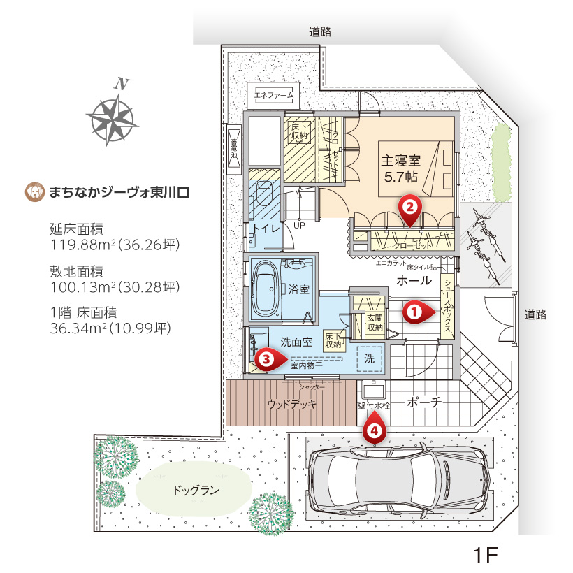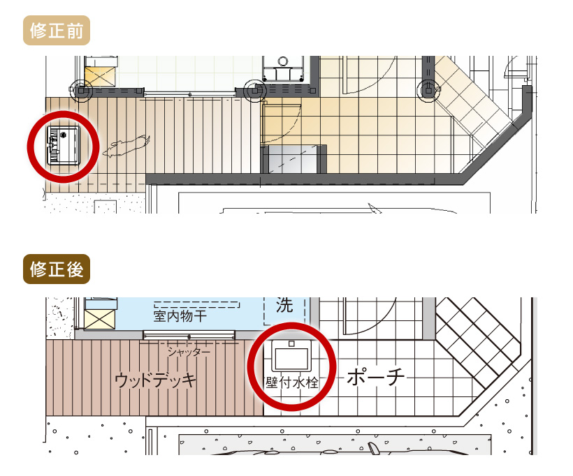 當(dāng)初はウッドデッキの奧を想定していたが、散歩のたびにそこまで行かなくていいように入口側(cè)に変更。