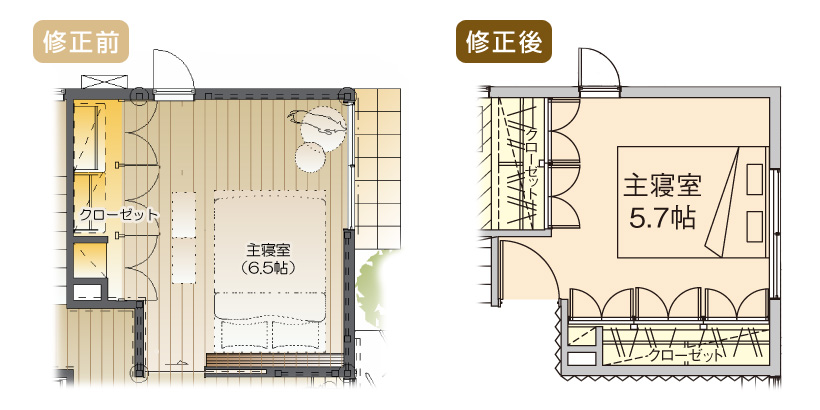 寢室の収納がやや少ないと感じたため、これも洋服が多いご家族を想定して収納を増やしてもらった。