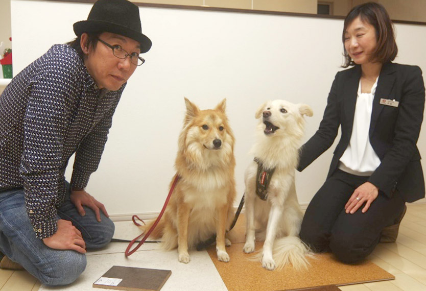 床材のサンプルの上を大吉と福助に歩かせて感觸を確かめる実験中