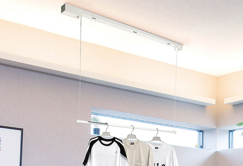 洗濯物を干すたびに3階のベランダに行くのは面倒だと感じたため、日當(dāng)たりのいい洗面臺に洗濯物が干せるよう室內(nèi)物干を設(shè)置。外出中に急な雨がふっても問題ない。