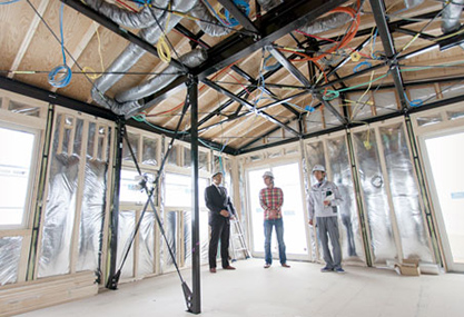 ダイワハウスの家は獨(dú)自の「鉄骨軸組&パネル併用構(gòu)造」で建てられる。簡(jiǎn)単にいうと柱が鉄骨で、壁などは工場(chǎng)で生産加工したものを組み立てていくというもの。そのため斷熱材などがすでに組み込んだ狀態(tài)で現(xiàn)場(chǎng)に屆く。これによって施工が早くなるうえ、棟上げ後は雨が內(nèi)側(cè)に入り込むことがなく天候の影響を抑えるという。