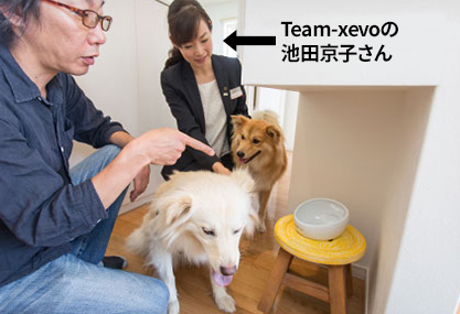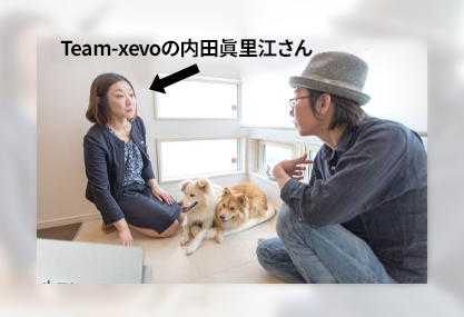 Team-xevoの內田眞里江さんと。くつろぎスペースは窓も低めで犬が外を眺められるようになっている