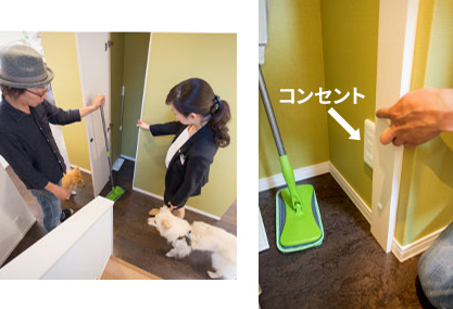 抜け毛が多い犬のために、掃除用具をさっと取り出せる収納スペースも作った。