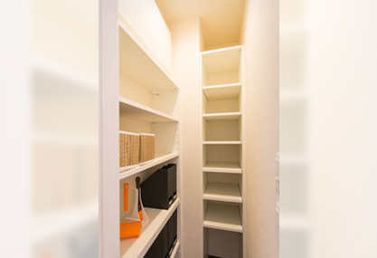 2階キッチン周りの収納はいくらあっても困らないので、パントリーと大容量の収納スペースを。その他、階段や3階の部屋にも、いたるところに収納スペースを設けてある。これまでの経験上、収納はできるだけあったほうが何かと生活しやすいと考えたためだが、見た目もそのほうがごちゃごちゃしなくていい。