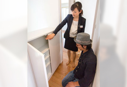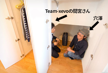 Team-xevoの間宮さんと穴澤。大人2人が入っても広く感じる階段下収納