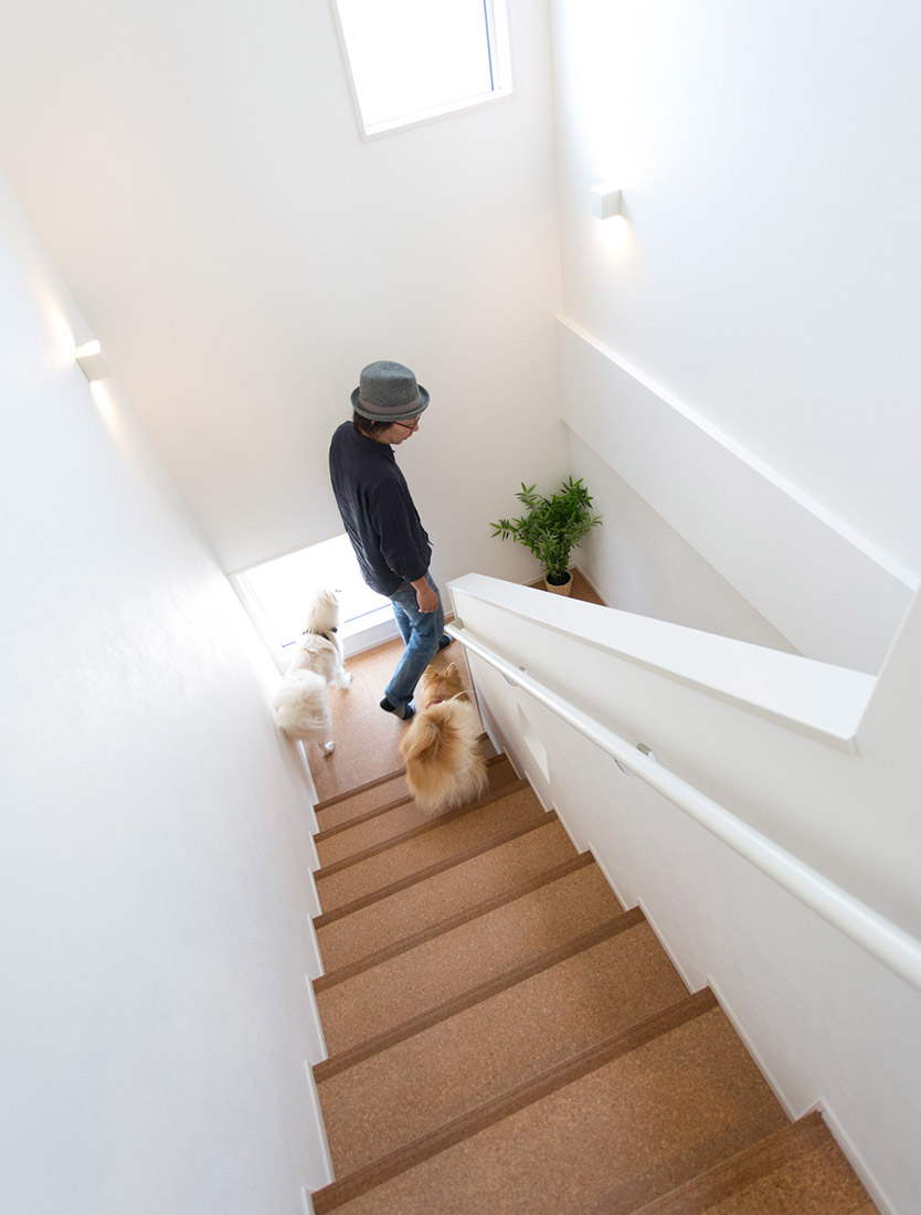 完成した家を見てもらったとおり、リビングの床をコルク材に、その他の床をシリコンコーティングに、水飲み場の設置、タイル張りの犬用スペース、そして傾斜の緩やかな階段などなど、今回の家には犬のために様々な配慮を施した。特にこの建坪の3階建てで緩勾配の階段は、かなりこだわった仕様になっていると思う。