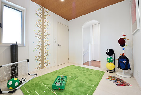 2階の各部屋の間にある、自由に遊べる空間。4.5帖あるので、ストレッチや體幹トレーニングをすることも。