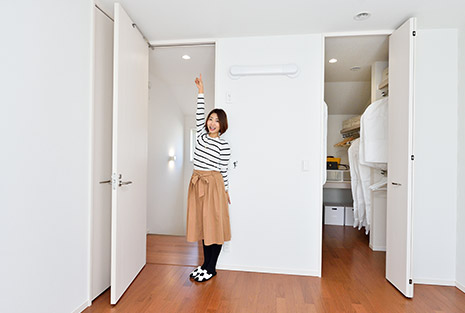 天候を気にせず、洗濯物が干せるように、室內物干を設置。物干しの高さは調整できるので、子どもやパパに任せることも。日當たりのいい場所にあるので、バルコニーに干しにいく手間が省けるのも嬉しい。