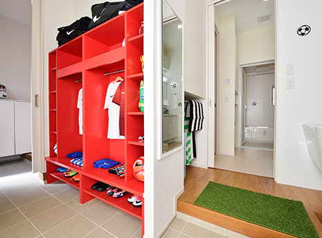 スポーツキッズがいる家やアウトドアファミリーによくある「汚れたものを部屋に持ち込みたくない」「用具の置き場がない」「洗濯物が多くて…」などの悩みを解決するために誕生しました。