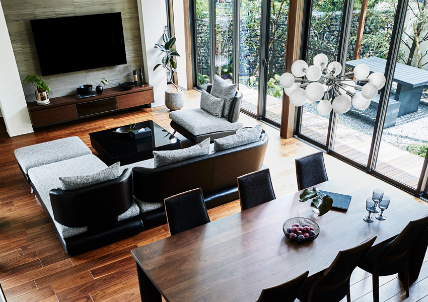 「近接する住宅環(huán)境を考えると南をあえて閉じ、街路樹まで窓の景色として取り込める北東?北西を開けた方が心地よいリビングになります」という設(shè)計(jì)士の提案にTさまご夫妻は共感されました。リビング橫には周囲の環(huán)境と美しく調(diào)和する里山風(fēng)の広い庭を。リビングを挾んだ向かい側(cè)には、大きな窓に囲まれた中庭コートを。周りにたくさんの景色と居場(chǎng)所をつくることで、居心地の質(zhì)を上げた庭とつながるリビングは、Tさまご家族はもちろんゲストの方のくつろぎにもつながっています。