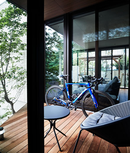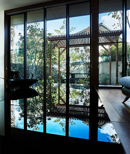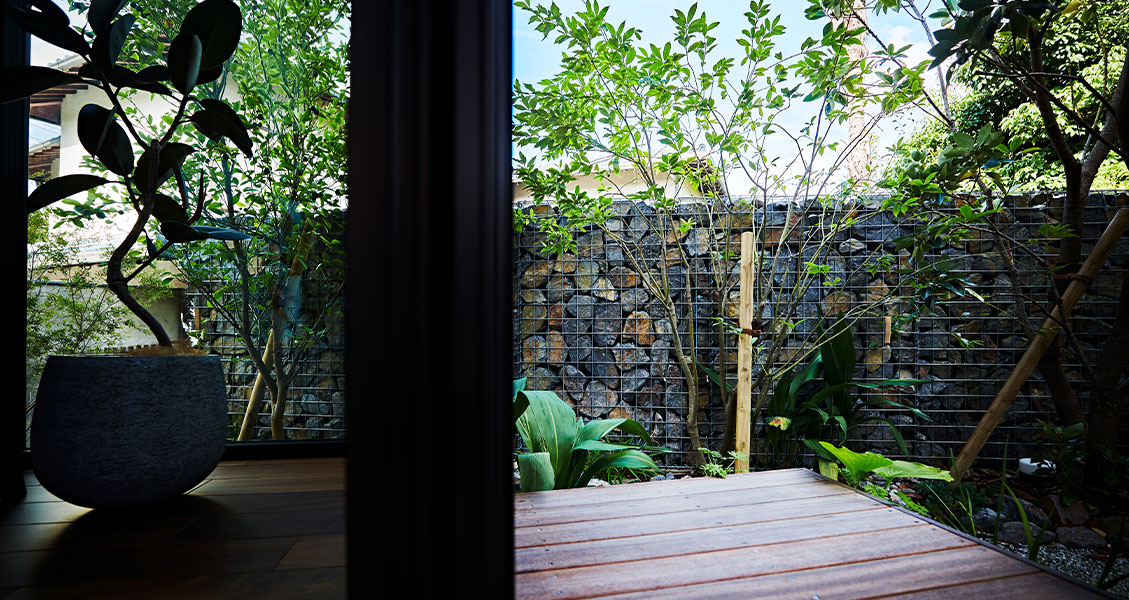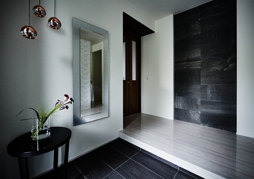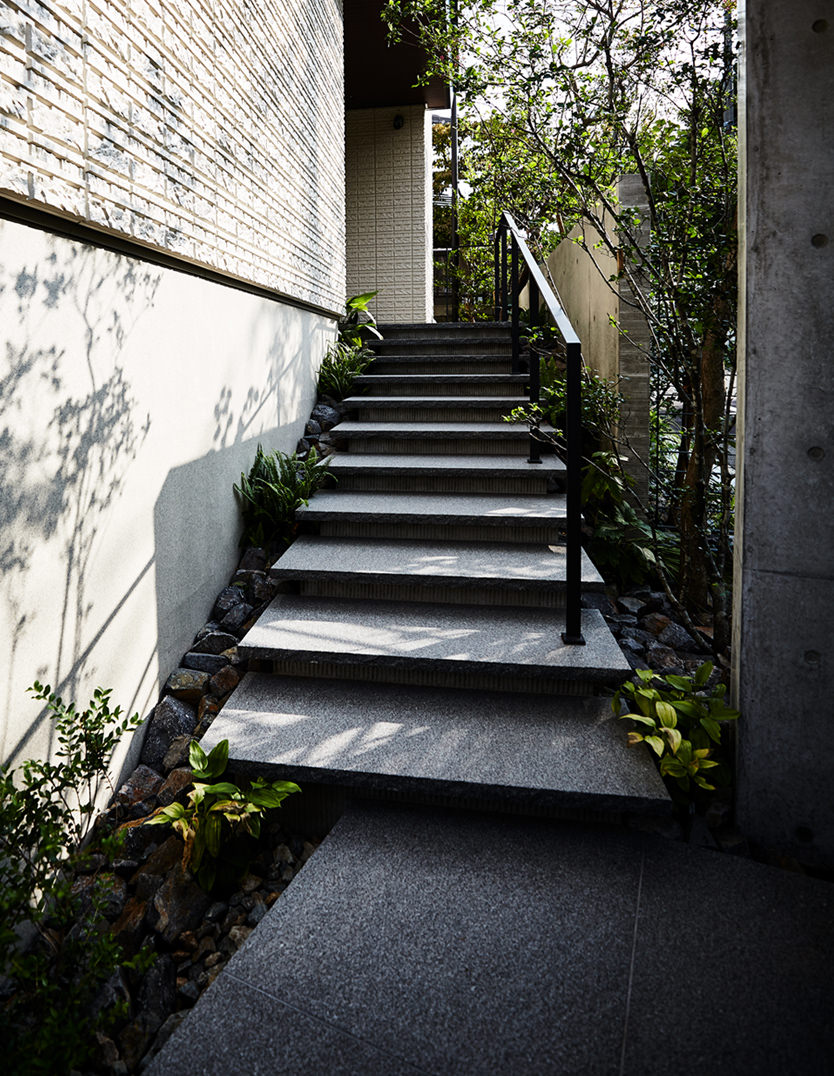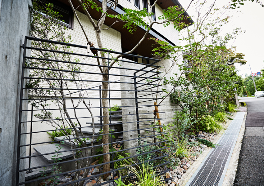 家のエッジを目立たせ、奧行きを印象づけた造形をはじめ、優(yōu)雅な印象を高める塀前のグリーンスペース、陰影が美しい深彫外壁、時(shí)が経つほど味わいが深まる素材を使ったエイジング外構(gòu)。街の一部となる「外」デザインは、ご近所さまとのコミュニケーションツールだと設(shè)計(jì)士は言います。また、重厚な木製門扉を開いた先にあるエントランス階段は、日々の“暮らしやすさ”に配慮した緩やかな段差です。プランニング當(dāng)初、外観やグリーンなど「外」にあまり関心をお持ちでなかったTさまご夫妻ですが、暮らしはじめて「外」の大切さを?qū)g感されました。妻の敬子さんは、ジョギングや散歩を楽しむご近所さまからよく聲をかけられるそうで、「Tさんの家が建ってから、道の雰囲気が明るくなったよ」とうれしい言葉をいただくこともあるのだとか。街の景観を美しく変えた「外」デザインは、ご近所さまの気分まで晴れやかにしています。
