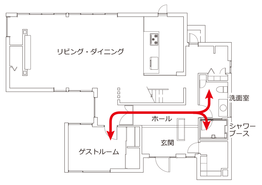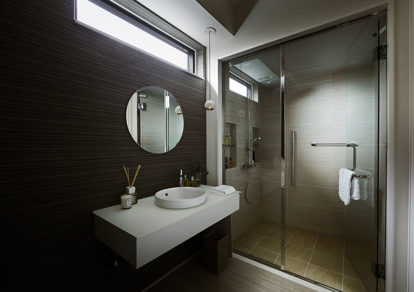 トイレとシャワーブースを備えたモダンなゲスト用洗面室は、ホテルのような上質(zhì)な時(shí)間が過ごせるとゲストに好評(píng)だそうです。ゲスト用洗面室への動(dòng)線は、家族の目が気になるリビングを通らずにゲストルームから移動(dòng)できる設(shè)計(jì)。「ゲストが気を使わず、くつろげる家にしたい」という、Tさまご夫妻の思いをかなえる工夫が至る所に盛り込まれています。