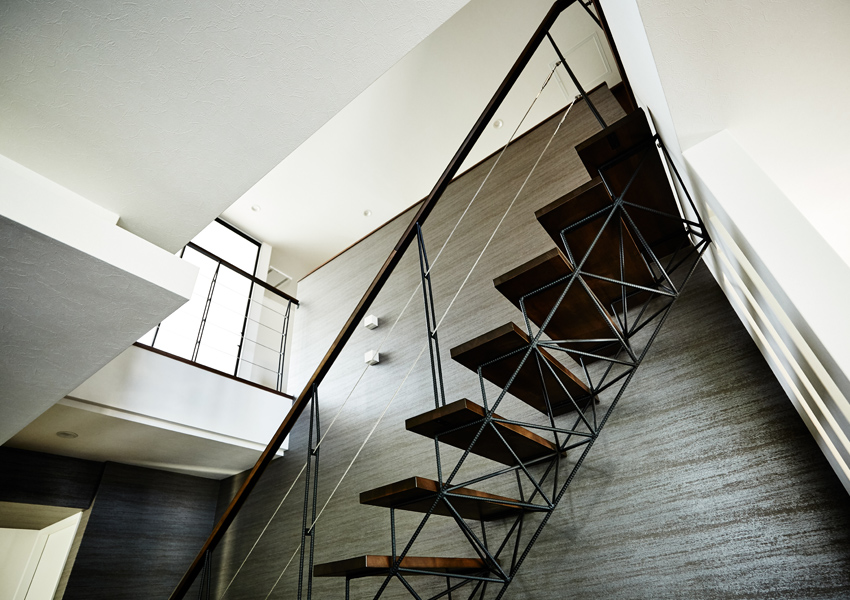 背景の高い壁が美しさを際立たせる、機(jī)能を超えた“見せる階段”。2階南側(cè)にあるライトスクリーン扉から取り入れる日の光は、階段を通して1階まで屆きます。