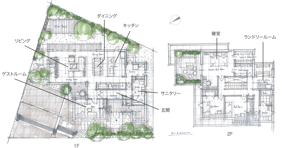 壁や柱を設(shè)けずLDKをひとつながりにしたレイアウトは、大人數(shù)のパーティーにも対応する広さを確保。TVの両側(cè)には奧行きを印象づける空間を設(shè)け、先に続く期待感を高めています。TVの裏側(cè)には隠れた収納とスタディコーナーがあり、キッチンの裏側(cè)にも大きなパントリーがあります。「収納が充実しているのでリビングはいつもキレイです」とTさまご夫妻。収納など“暮らしの機(jī)能”を十分にかなえながら隠し、庭の緑が映り込む大きなガラステーブルやオブジェのような“見せる階段”など「デザインの見せ場(chǎng)」をつくる、バランスのとれた設(shè)計(jì)が美しい日常を支えています。