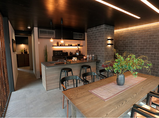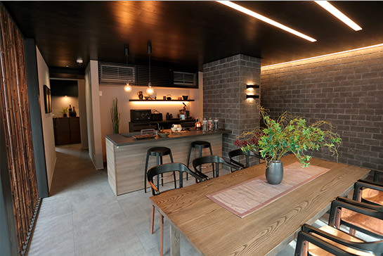 ダーク調(diào)のインテリアでまとめられたダイニング。緑豊かな植栽、森の薫り、自然の音、そんな「五感のゆらぎ」がドアを開けた瞬間、心と體を都市の喧噪から解き放してくれます。