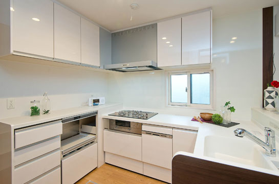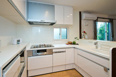 コンパクトにまとまったL字型のキッチン。スタイリッシュなコンロや食器洗浄機(jī)がついているのはもちろん、収納も充実。
