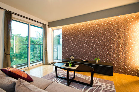 リビングは壁のデザイン、間接照明、窓からの景色など、くつろぐための配慮を隨所に感じました。あったらいいなぁと思うところにコンセントやスペースがあるので、とても生活しやすそうですね。