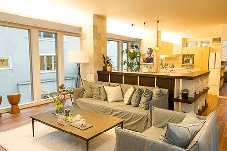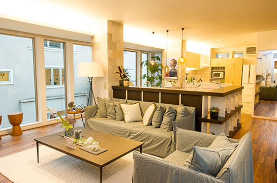 2階のリビングは、大きなガラス窓が連なり、陽ざしもたっぷり。