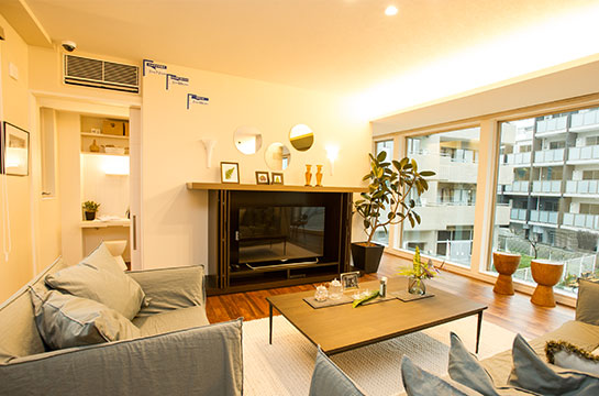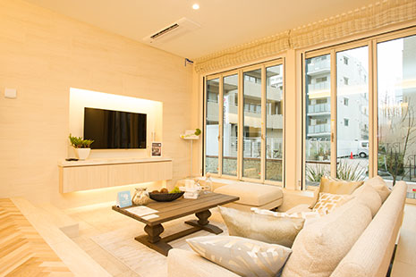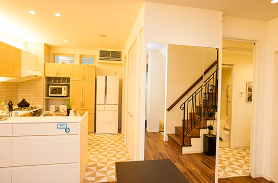 「skye」 は、限られた敷地を効率よく活用できるので、都市での暮らしや二世帯住宅にむいているのが特徴。馬込展示場の「skye」は、天井高2m72㎝を実現し、収納と家事動線にもこだわっています。