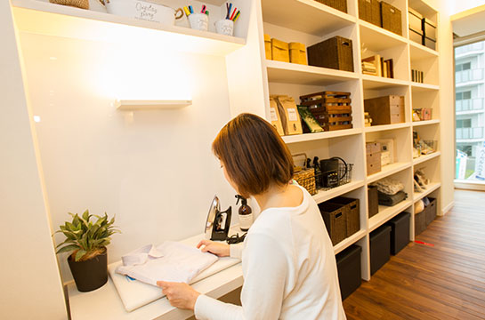 リビング収納は高さもあり、たっぷり収納できる。アイロン臺があるのも嬉しい。
