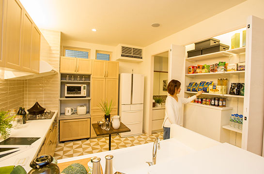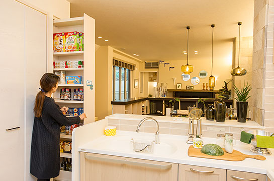 家事をしながら會話が弾むようにと、アイランドキッチンを設置。その脇には、階段下を有効活用してパントリーに。