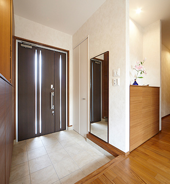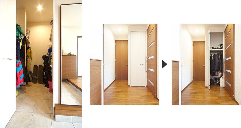 「できるだけ家具を置かずに、すっきりさせたい」という希望から、作りつけの収納をたっぷり設けました。趣味の物を入れる玄関収納を大きくとり、ホールには帰宅してすぐにコート類を掛けられるクローゼットを設置しました。