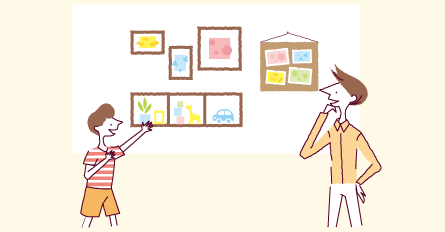 作家のものも良いですが、子どもたち自身の作品を飾れば楽しさが膨らみます。コルクボードなどを使うのも良いでしょう。