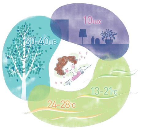次は「音」について。光と同様で、全くの無音は不安感をもたらし、かえって眠りにくくなります。図書館の中やそよ風に揺らぐ木の葉の音のように、靜かな中にも少し音があると、気持ち良く眠りやすくなります(30~40dB)。