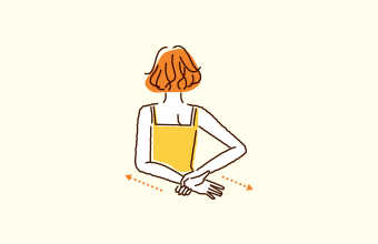 - 1背中側に手を回し、左手首を右手で持ち、両腕を広げるように引き合います。
