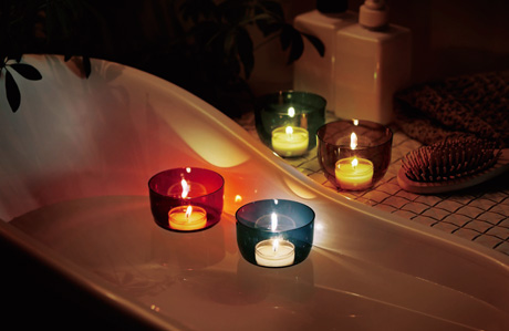 お風呂で楽しむ「バスキャンドル」。水面に映し出されたキャンドルの燈りに、心も洗われます