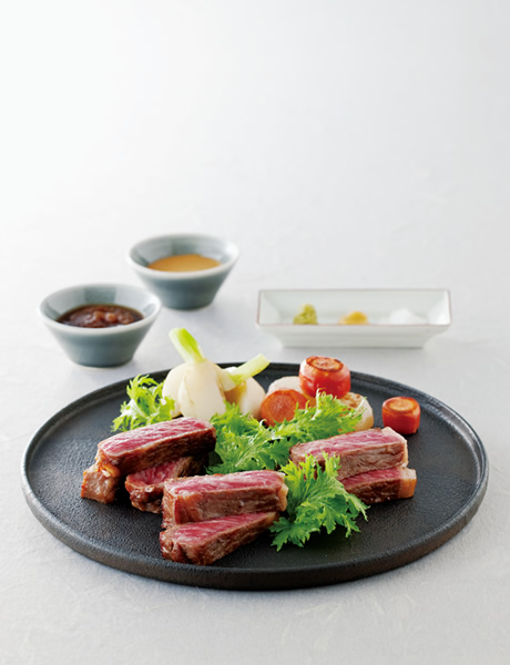 ステーキ肉をシンプルに焼いて食べやすくカット。大皿に冬野菜とともに彩りよく盛りつけて、取り分けるスタイルに。2種類のタレやわさび、からしなどを添えてお好みの味でいただきましょう。