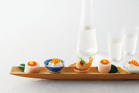 お酒に合う、ひと口サイズの前菜を盛り合わせて。赤と白の食材を使ってお祝いらしさを演出。