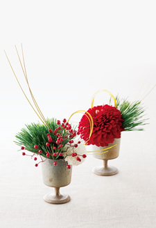 新春の集いにふさわしくテーブルにも花を。小さめの陶器やグラスに生ければ、食事の邪魔にならずに華やかさを演出できます。寫真は赤と白の菊、松などを器の深さに合わせて莖をカットし、水引は丸めてワイヤーで留めて生けます。