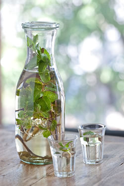 容器に、きれいに洗ったミントとレモングラス、レモンバーベナなど、お好みのハーブを入れ、水を注ぎ、冷蔵庫でひと晩冷やしておく。ミントだけでもよいが、いろいろなハーブを組み合わせて楽しんでも。
